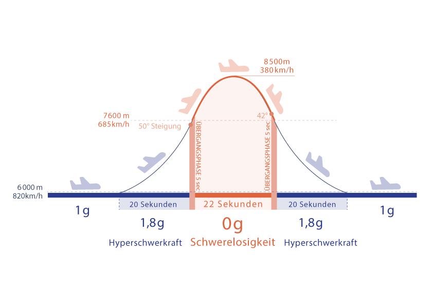 In dieser Phase herrscht im Flugzeug bis zu 1,8 mal erhöhte Schwerkraft im Vergleich zur Schwerkraft auf der Erde. Dies wird als Hyperschwerkraft bezeichnet.